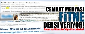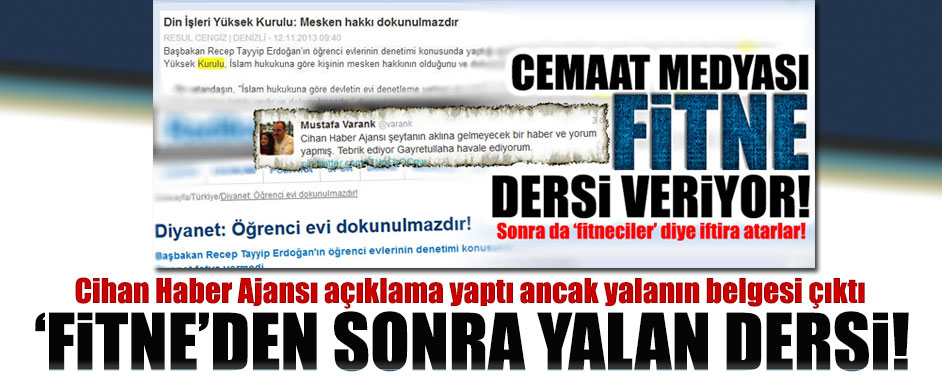 Cemaat medyasının nasıl fitne çıkardığına ilişkin tepkiler üzerine de Cihan Haber Ajansı yeni bir açıklama yaptı. Açıklamada, “’Din İşleri Yüksek Kurulu: Mesken hakkı dokunulmazdır’ başlıklı haberimiz bazı internet siteleri tarafından maalesef bağlamından koparılarak kullanılmıştır. Haberimiz, Din İşleri Yüksek Kurulu’nun, bir vatandaşın ‘İslam hukukuna göre devletin ev denetleme yetkisi var mıdır?’ sorusuna verdiği cevaba dayanmaktadır. Haberin başlığı ve içeriği başka bir tarafa çekilmeyecek kadar açıktır. Kurulun açıklamasında Başbakan Recep Tayyip Erdoğan’ın öğrenci evlerine yönelik açıklamalarına değinilmediği gibi, haberde de böyle bir iddia yer almamaktadır. Yine de yanlış anlamaya yol açma ihtimali taşıyan haberin ilk cümlesini düzenleyerek yeniden servis ediyoruz.” denildi.