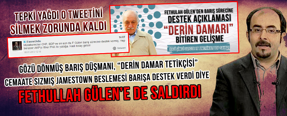 MEDYAGÜNDEM- Kürt sorununun çözümü konusunda toplumda büyük bir umut yeşermesine neden olan İmralı sürecini sabote etmek için “deli gibi” saldıran “derin damar tetikçisi”, CIA ve Neo-conlarla irtibatlı Jamestown Vakfı’nın “beslemesi” Taraf yazarı Emre Uslu, son sürece desteğinden dolayı Fethullah Gülen’e de saldırdı.
