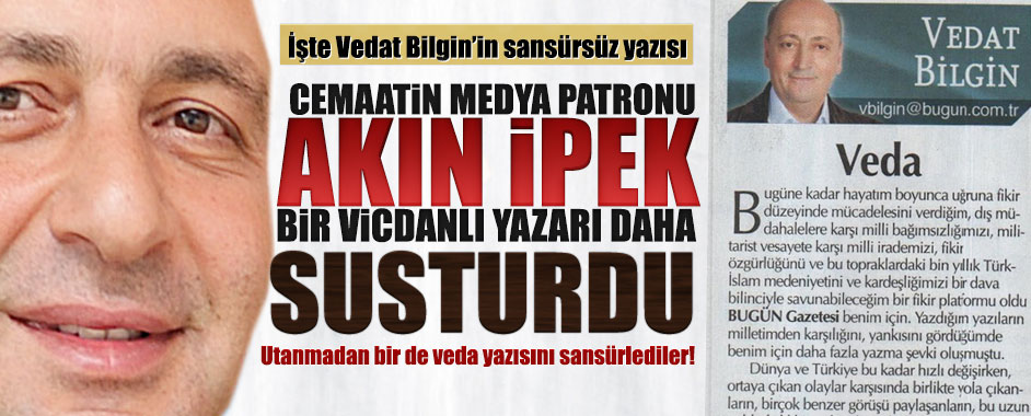 MEDYAGUNDEM.COM- Cemaat medyası bir vicdanlı yazarı daha susturdu. 17 Aralık’ta sahnelenen sivil ve meşru hükümete darbe girişiminin medya ayağında yer alan Akın İpek’in sahibi olduğu Bugün gazetesi Ahmet Taşgetiren’den sonra Vedat Bilgin’le de yollarını ayırdı.