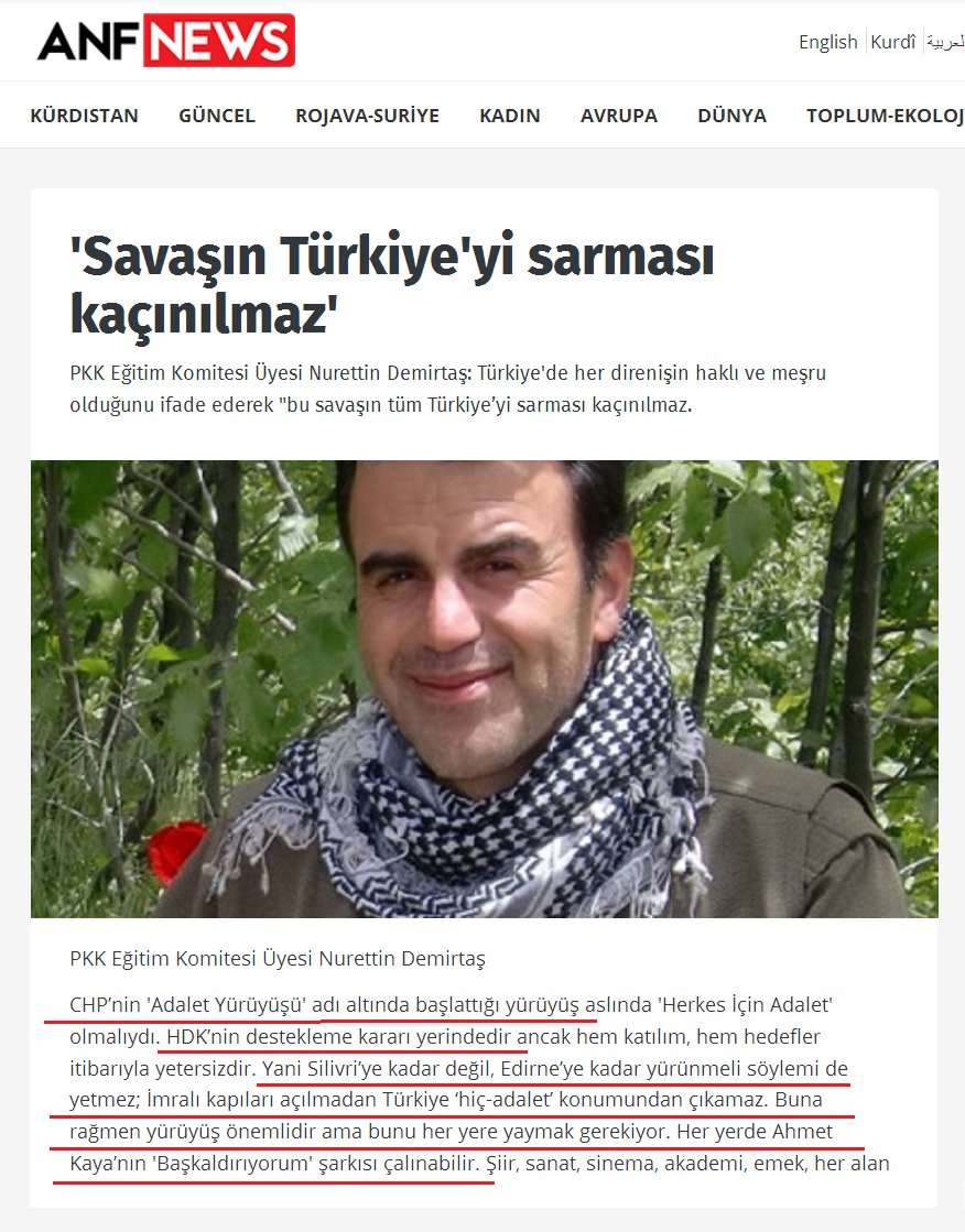 CHP Genel Başkanı Kemal Kılıçdaroğlu’nun sözde adalet yürüyüşü adı altında planladıkları kirli tezgah gün geçtikçe ortaya çıkıyor. ‘Adalet’ süslemesiyle çıkılan yolun sonunda kaos planları yapılıyor. PKK ve FETÖ destekli yürüyüşün İstanbul’a varış tarihini 15 Temmuz’a hedefleyen kaos ittifakı büyük bir provokasyonun fitilini ateşlemek istiyor… HDP eş genel başkanı Selahattin Demirtaş’ın PKK’lı terörist kardeşi Nurettin Demirtaş, “Türkiye’de savaşı yayın” diyerek CHP’yin kaos yürüyüşüne destek vermesi bir yana, FETÖ’cü kaçak terörist Emre Uslu’nun da Twitter’dan yaptığı destek, CHP’nin FETÖ ve PKK terör örgütleriyle Türkiye’de kaos için kirli bir tezgah içinde olduğunu gösterdi.