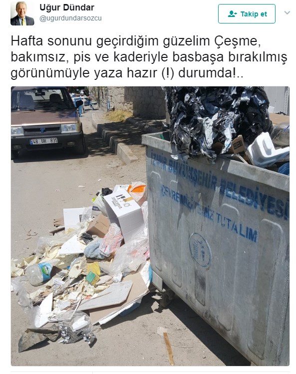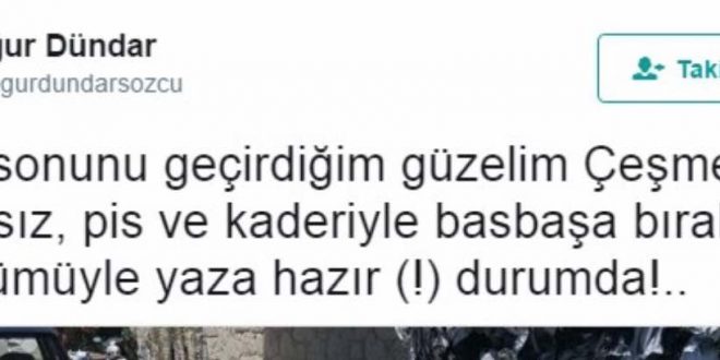 Dündar, “Hafta sonunu geçirdiğim güzelim Çeşme, bakımsız, pis ve kaderiyle basbaşa bırakılmış görünümüyle yaza hazır (!) durumda!..” sözleriyle tepkisini dile getirdi.
