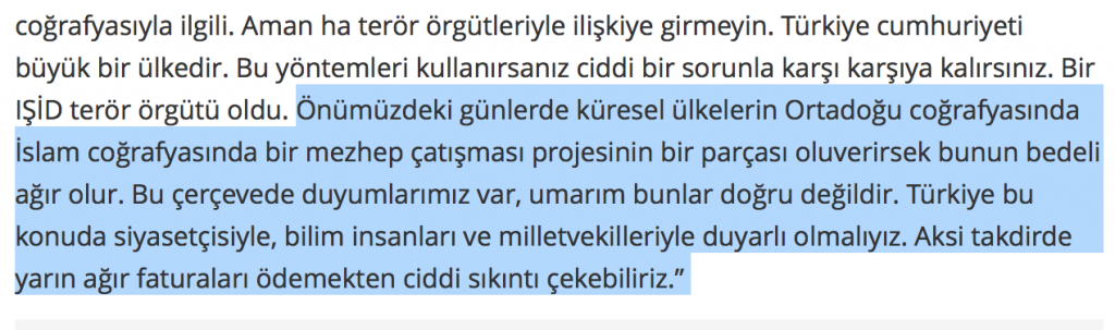 “Önümüzdeki günlerde küresel ülkelerin Ortadoğu coğrafyasında İslam coğrafyasında bir mezhep çatışması projesinin bir parçası oluverirsek bunun bedeli ağır olur. Bu çerçevede duyumlarımız var, umarım bunlar doğru değildir. Türkiye bu konuda siyasetçisiyle, bilim insanları ve milletvekilleriyle duyarlı olmalıyız. Aksi takdirde yarın ağır faturaları ödemekten ciddi sıkıntı çekebiliriz.”