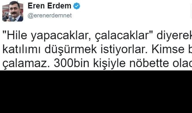 6 Nisan tarihinde, “Hile yapacaklar, çalacaklar diyerek sandığa katılımı düşürmek istiyorlar. Kimse birşey çalamaz. 300 bin kişiyle nöbette olacağız. Sandığa” diye tweet atan Erdem, halkoylamasından bir gün sonra ise, “Diktatör, OHAL’i 3 ay daha uzatmış. Oy çalarak aldığı seçimin getirdiği yetkilere kadar OHAL ile devam diyor. Hırsızsınız, hesap vereceksiniz” dedi.