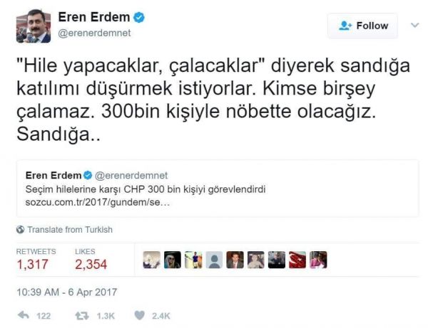Halkoylamasında ‘Evet’ çıkmasının ardından CHP ve HDP ‘mühürsüz pusula’ bahanesiyle seçimlerin şaibeli olduğunu iddia ederken, Eren Erdem’in 16 Nisan’dan önce attığı bir tweet dikkat çekti.