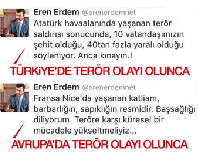 Fakat Erdem’in Türkiye’de terör olayı yaşandığında tek düşündüğü şey bunu siyasi amaçları için kullanmak oluyor.