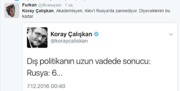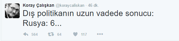 Çalışkan, Beşiktaş’ın 6-0 mağlubiyetinin ardından twitter hesabından “Dış politikanın uzun vadede sonucu: Rusya: 6…” diye yazdı.