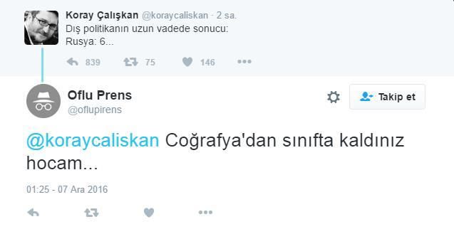 Attığı mesajın ardından sosyal medyada kendisine bir çok tepki tweeti gelen Çalışkan’a takipçileri, “Coğrafya dersinden sınıfta kaldın” şeklinde mesajlar attı.