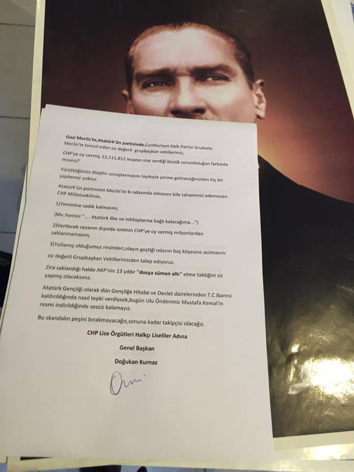 Halkçı Liseliler Genel Başkanı Doğukan Kurnaz, CHP Grup Başkanvekilleri, Engin Altay, Özgür Özel, Levent Gök’e Uşak’tan kargoyla Atatürk portresi ve mektup gönderdi. Kurnaz, gönderdiği mektupta sorumlunun açıklanmasını istedi ve “Bu skandalın peşini bırakmayacağız, sonuna kadar takipçisi olacağız.” dedi.