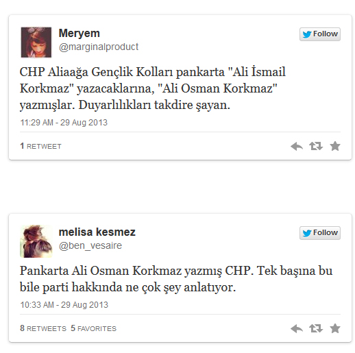 CHP Gençlik Kolları, İzmir Aliağa’da Gezi direnişi sırasında hayatını kaybedenler için parti binası önüne pankart astı. Ancak o pankartta dikkat çeken detay ise Eskişehir’de Gezi Parkı eylemleri sırasında hayatını kaybeden Ali İsmail Korkmaz’ın ismini ‘Ali Osman Korkmaz’ olarak yazmasıydı.