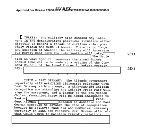 ABD Merkezi İstihbarat Teşkilatı (CIA) tarafından internet kullanıcılarının erişimine açılan belgelerde, 12 Mart 1971 tarihinde ordunun hükümete muhtıra verebileceğine dair bilginin bir gün önce CIA istihbarat bülteninde yer aldığı ortaya çıktı.
