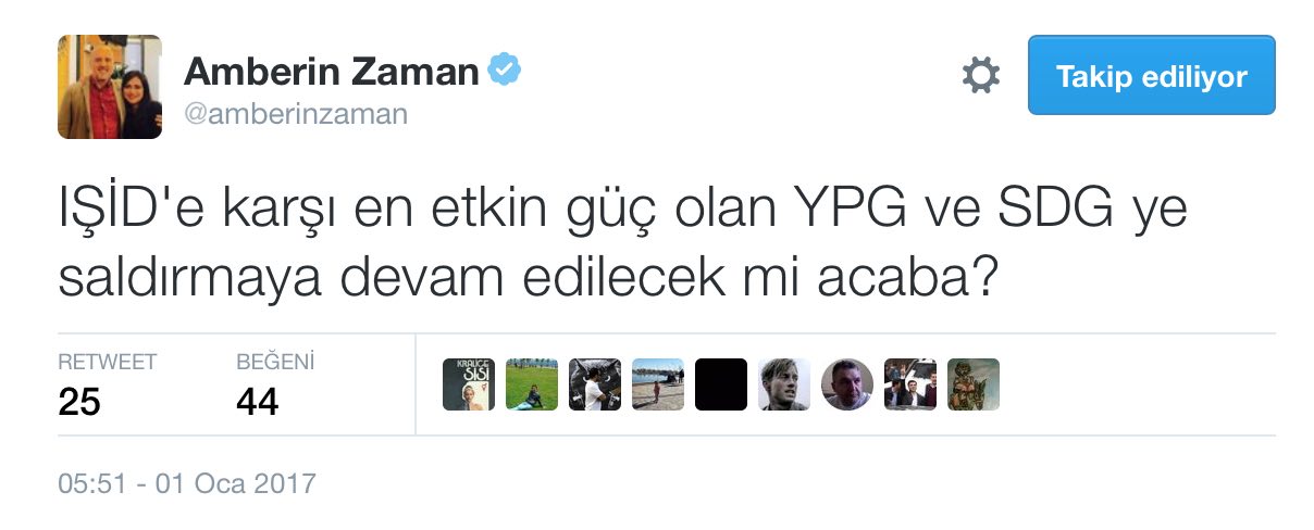 Kocası CIA ajanı olan ve FETÖ ile PKK terör örgütlerinin medyadaki azılı savunucusu Amberin Zaman, Reina’daki terör saldırısından sonra da çıkıp, PKK ve Suriye’deki uzantısı PYD ile YPG’yi kutsadı! IŞİD’e karşı dünyada tek mücadele eden Türkiye olmasına rağmen, DEAŞ’ın arkasındaki ABD’yi perdeleyip, YPG’yi de DEAŞ’a karşı savaşın tek çözümü olarak göstererek, hainliğini yine gösterdi. Bir terör örgütüyle mücadeleyi başka bir terör örgütüyle yapmayı çözüm olarak sunan CIA tasmalı Amberin Zaman, terörün gerçek patronu ABD’ye yine tek laf etmedi.