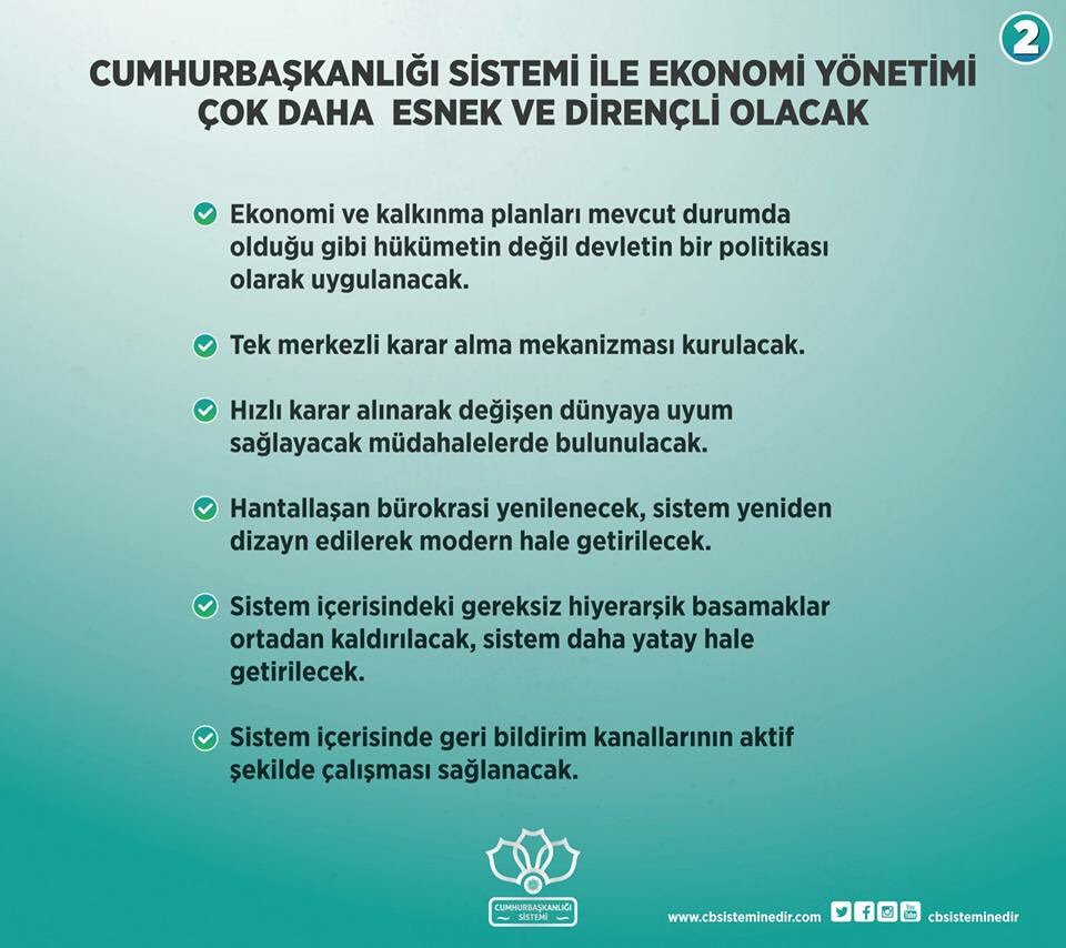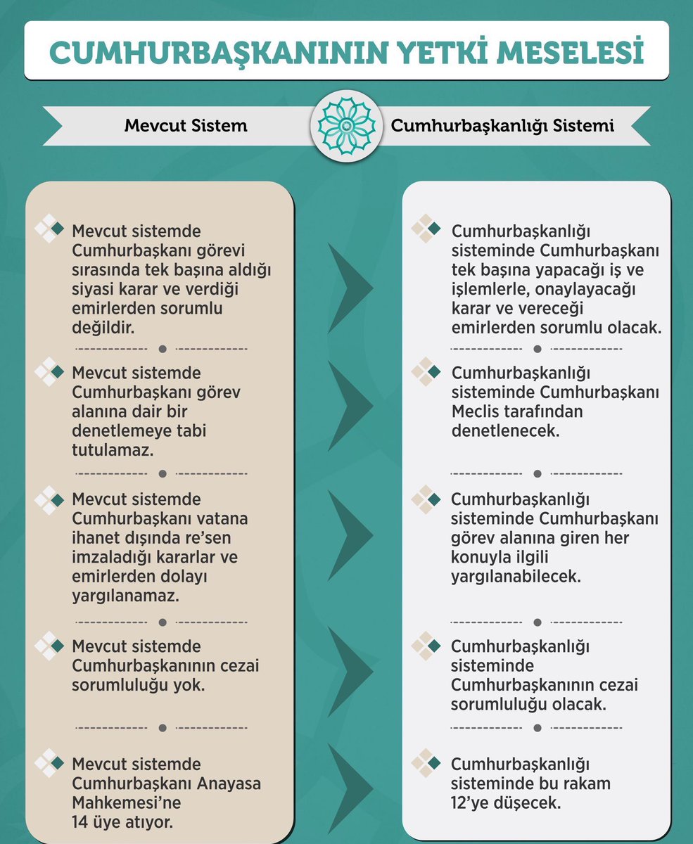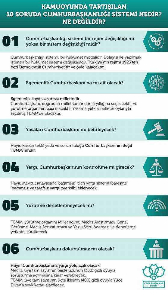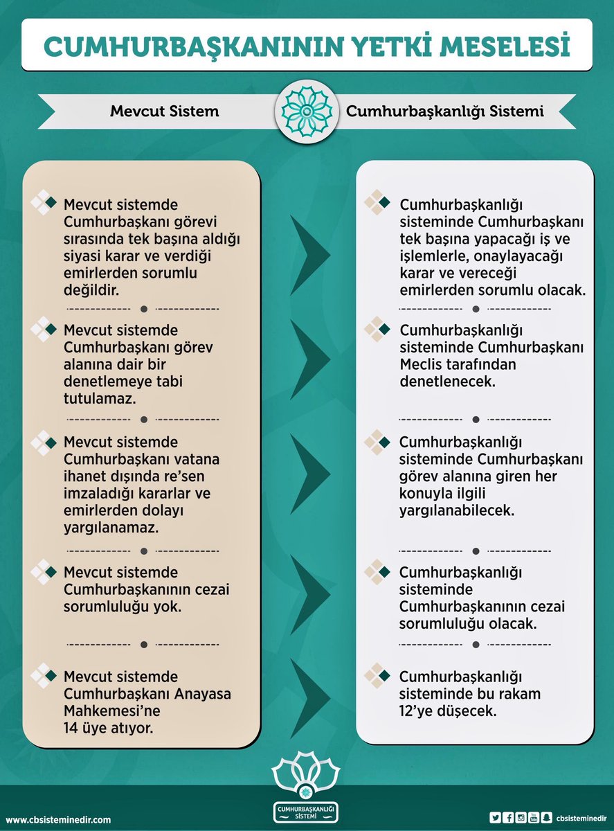 Cumhurbaşkanlığı Sistemi için referandum Nisan ayında yapılacak. Peki yeni sistem hayatımızda neleri değiştirecek. Eski ve Yeni sistem arasındaki farklar neler? Cumhurbaşkanlığı sistemi hakkında ortada birçok yalan iddialar ve karalama kampanyası dolaşıyor. İşte Cumhurbaşkanlığı sistemi hakkında merak edilen her şey…. CBSistemi isimli Twitter hesabından paylaşılan bilgiler şöyle…