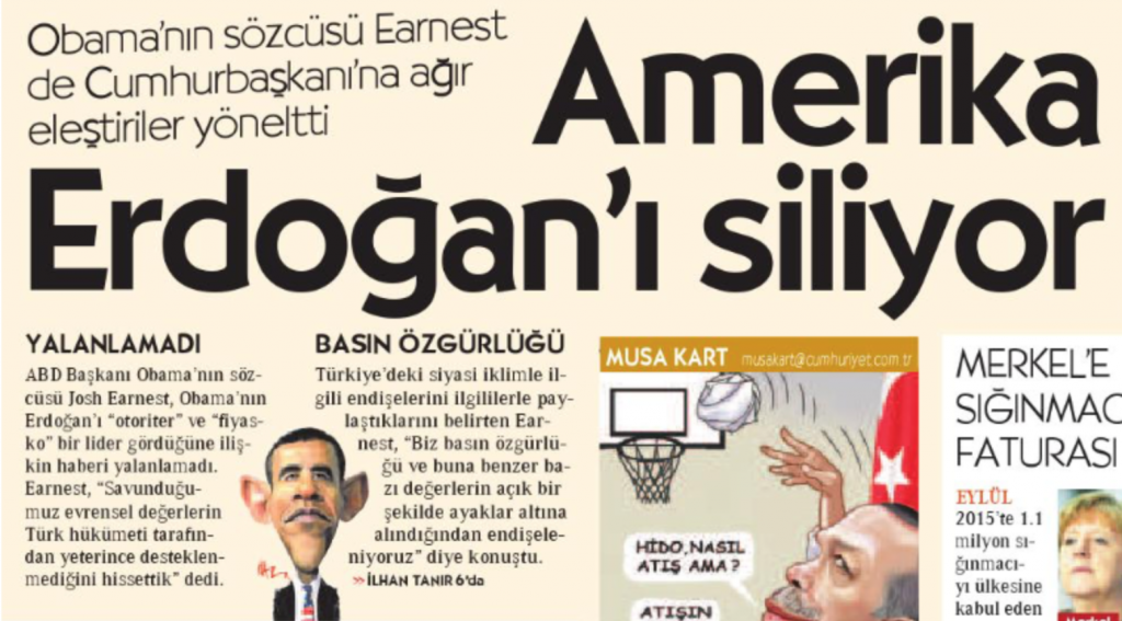 Ankara’daki son kanlı terör saldırısının amacının Türkiye’ye diz çöktürmek, Türkiye’yi terörle teslim almak ve direk Cumhurbaşkanı Erdoğan’ı hedef aldığı apaçık ortada. İşte bugün PKK-FETÖ tetikçisi Cumhuriyet’in manşeti… “Amerika Erdoğan’ı siliyor” manşetini atan Cumhuriyet, Ankara’daki patlayan bombanın da sebebini açıklıyor aslında. Bu habere imzayı atan İlhan Tanır’ın her ne kadar Türk ismi taşısa da Türkiye düşmanı, FETÖ tetikçisi ve tamamen ABD çıkarlarına hizmet eden bir “etki ajanı” olduğunun altını çizelim… Cumhuriyet bu manşetiyle Ankara’daki terörün hem failiyle ortak olduğunu, hem de hedefin ne ne olduğunu açık ediyor.