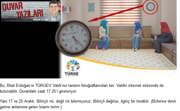 Doğan Satmış, TÜRGEV Vakfı’nın Yönetim Kurulu üyesi olan Bilal Erdoğan’a karşı kullandığı fotoğrafta duvarda asılı olan saatin 17:25’i gösterdiğini iddia etti. 17-25 Aralık Darbe girişimine ima yapan Satmış’ın kullandığı resimlere ulaştığımızda duvardaki saatin 17:45’i gösterdiği ortaya çıktı.