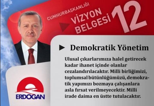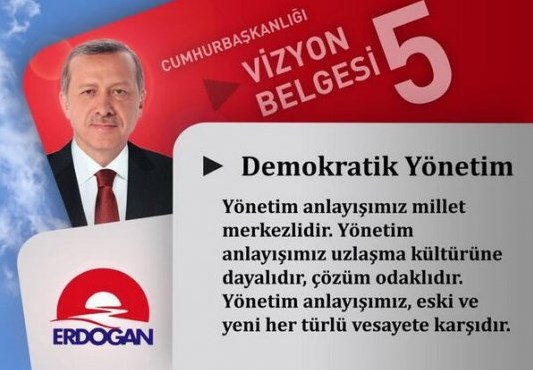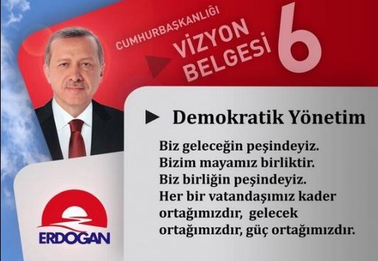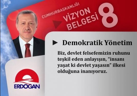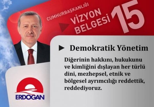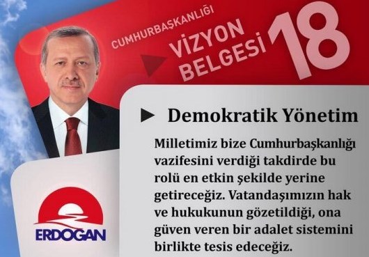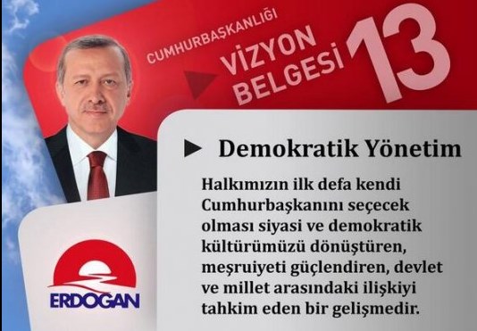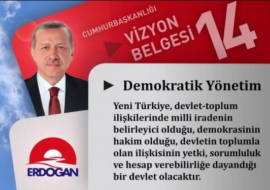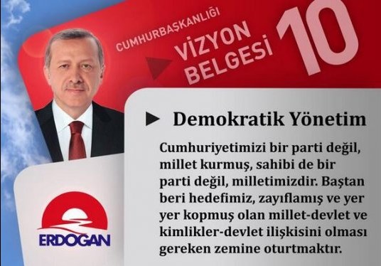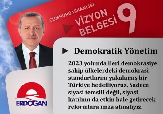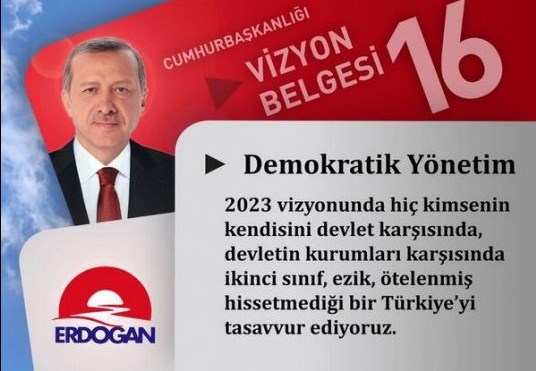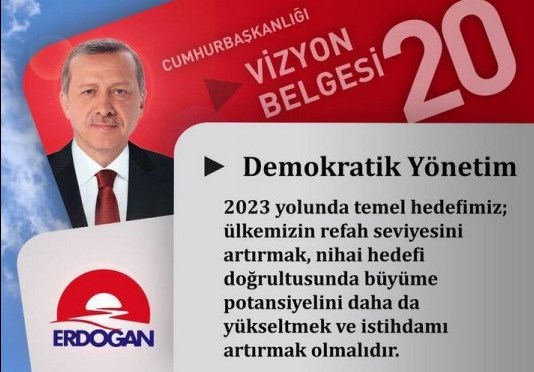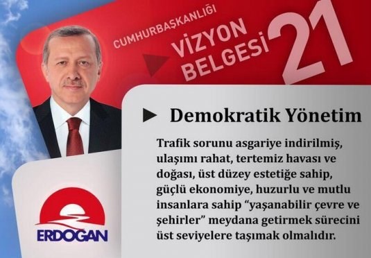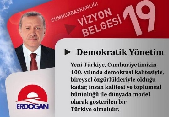 Cumhurbaşkanlığımız süresince, yol haritamız olacak vizyon belgesi “Yeni Türkiye Yolunda” ismini taşıyor. Altında şunu göreceksiniz. Demokratik yönetim, refah toplumu ve öncü ülke başlıkları bulunuyor. Neyi kast ediyoruz? 12 yılda ülkemizin dört alanda dönüşmesine yollar açtık. Demokratikleşme refah şehirleşme uluslararası ilişkiler. 12 yıl evveline göre çok daha demokratik bir ülkedir. Demokratikleşme hedefimizden taviz vermedik.