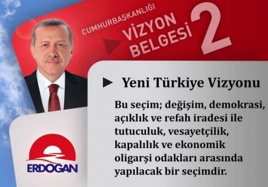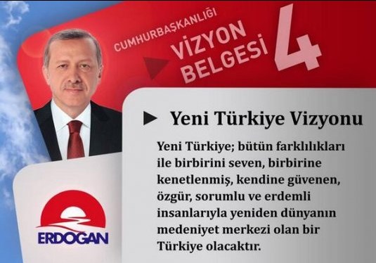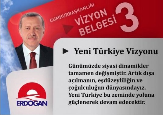 Cumhurbaşkanlığına aday olan Başbakan Erdoğan, vizyon belgesini açıkladı. Erdoğan, “Yeni Türkiye Yolunda” isimli belgede, demokratik yönetim, refah toplumu ve öncü Türkiye başlığı bulunduğunu söyledi.