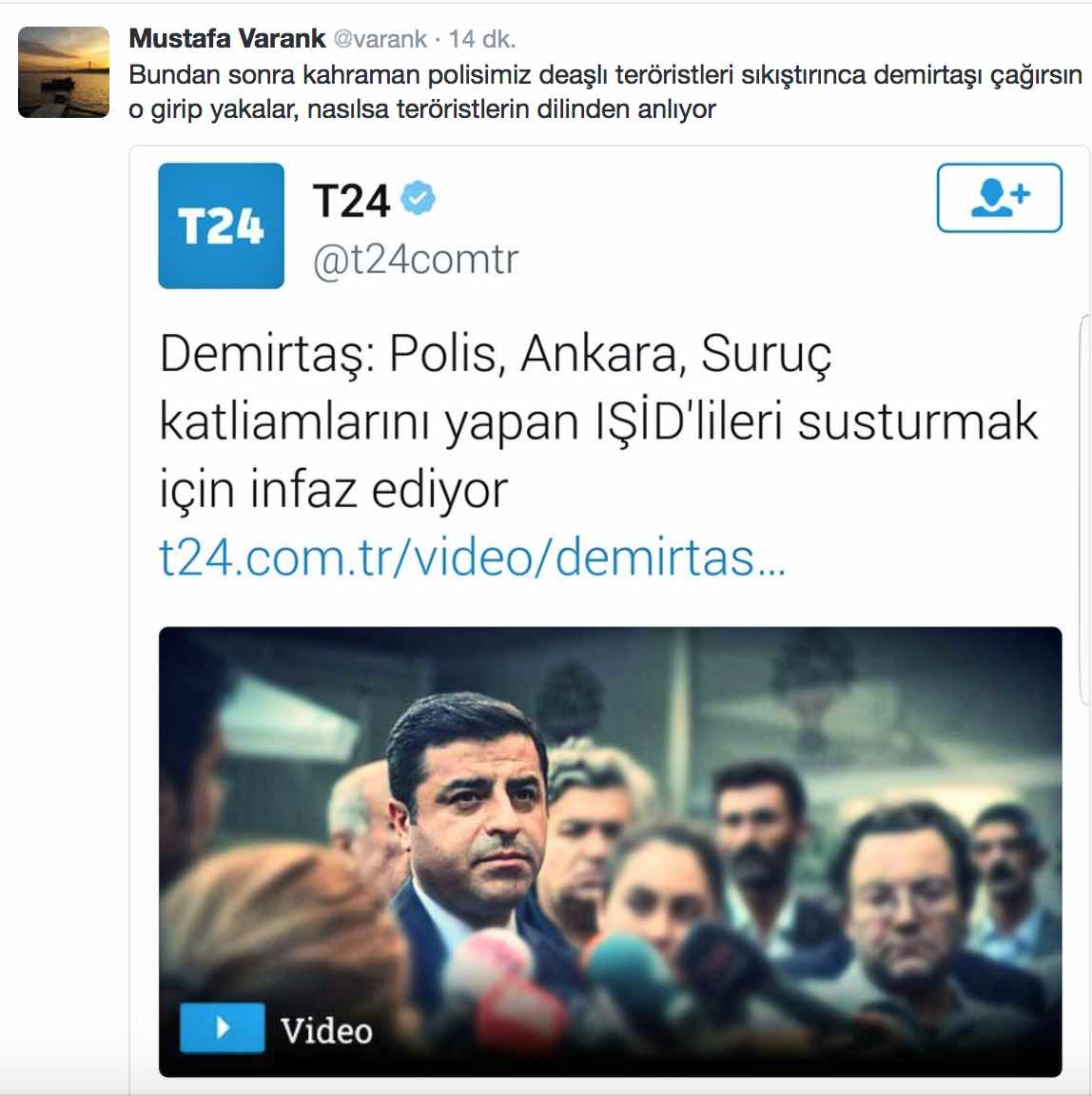 HDP Eş Genel Başkanı Selahattin Demirtaş, en son Gaziantep’teki hücre evlerine gerçekleştirilen baskın sırasında peş peşe kendini patlatarak öldürülen DAEŞ militanlarıyla ilgili ortaya attığı akla ziyan yalana Cumhurbaşkanı Erdoğan’ın başdanışmanı Mustafa Varank’ın kapağı cuk diye oturdu.