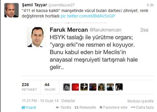 MEDYAGUNDEM.COM- Dün “411 el kaosa kalktı” manşetini atıp, milletin meclisinin meşruiyetine kasteden Ertuğrul Özkök’ün 2014 versiyonu cemaat medyasından çıktı. Akın İpek’in sahibi olduğu Kanaltürk’ün Ankara Temsilcisi cemaat gazetecisi Faruk Mercan, HSYK kanun tasarısı nedeniyle TBMM’yi “gayrimeşru” ilan edip, dünün darbecileri gibi şoke eden bir çıkış yaptı.