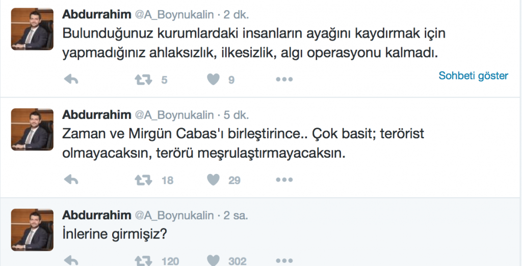 FETÖ’nün terör propaganda silahı Zaman gazetesine el konulması ve CNN Türk’te terör örgütlerini cesaretlendirici yayınlar yapan Mirgün Cabas’ın kovulmasına Ak Parti milletvekili Abdurrahim Boynukalın’dan Twitter’da çarpıcı bir yorum geldi.
