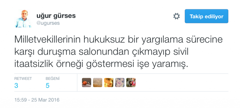 Petrol Ofisi soygunuyla devleti dolandırmaktan yargılanan Aydın Doğan’ın Hürriyet’te yazar olarak beslediği Uğur Gürses, Can Dündar ile Erdem Gül’ün yargılandığı vatana ihanet ve casusluk davasını CHP ve HDP’li milletvekilleri sabote edip hukuku çiğnediler diye alkış tutuyor… Mahkemeyi işgal etmek şu Aydın Doğan beslemesine göre “sivil itaatsizlik”… Aydın Doğan acaba devleti soymaktan yargılandığı mahkemeleri tanımama mesajı mı veriyor böyle?