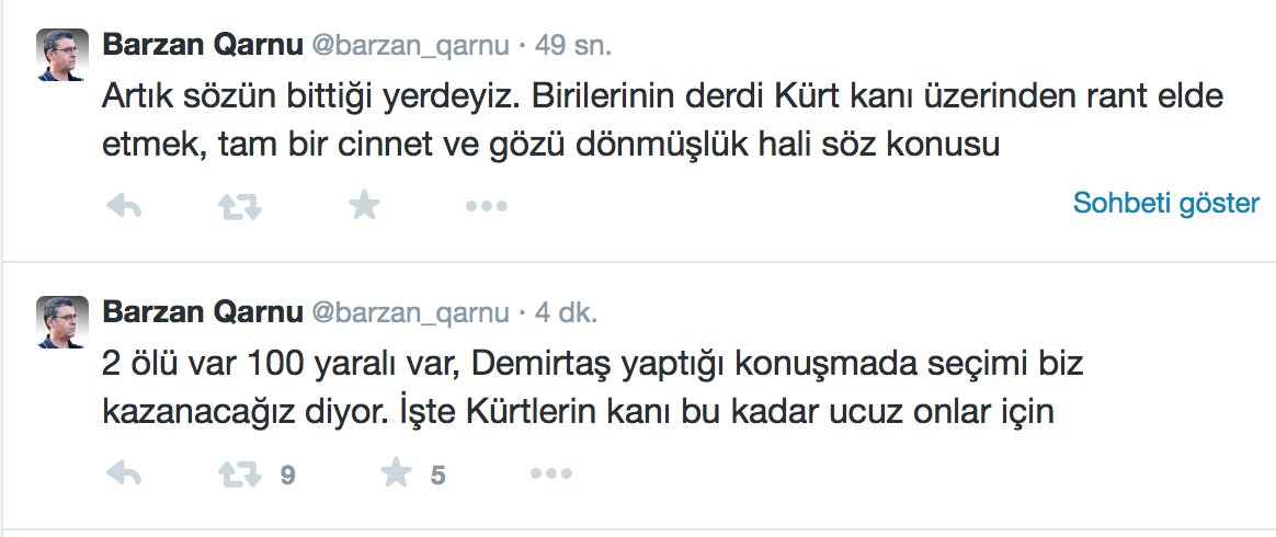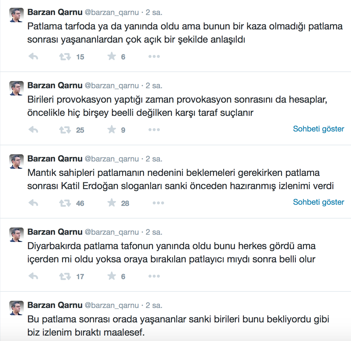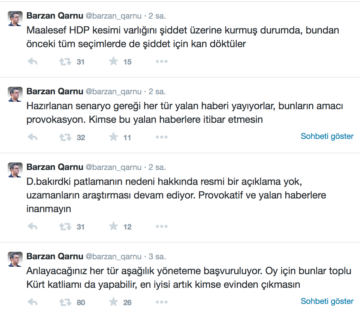 Bunca seçim yaşadık biz bu ülkede sesiz sakin ne zaman ki hdp seçime katıldı kan dökülmeye başladı bu elbette ki tesadüf değil baraj altında kalacağını anlayan hdp son mitingini şova dönüştürdü. can dündar kıduz köpeği de operasyonun kendi üzerlerine düşen kısmında devreye girip, tweet atarak algı operasyonuna başlattı.ve hemen akabinde devreye cnn türk ve şirin payzın girdi hdp lil milletvekilleriyle ( diyarbakırdan stüdyoya o kadar çabuk nasıl damladılarsa) devam ettiler operasyona diğer tüm kanallar normal yayın akışlarına devam ederken cnn sündüre sündüre saatlerce özellikle bu konuya ilişkin yayın yaptı. Herşey önceden tezgahlanmıştı herrşey!