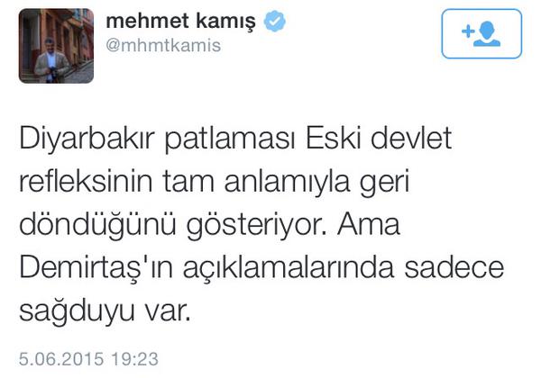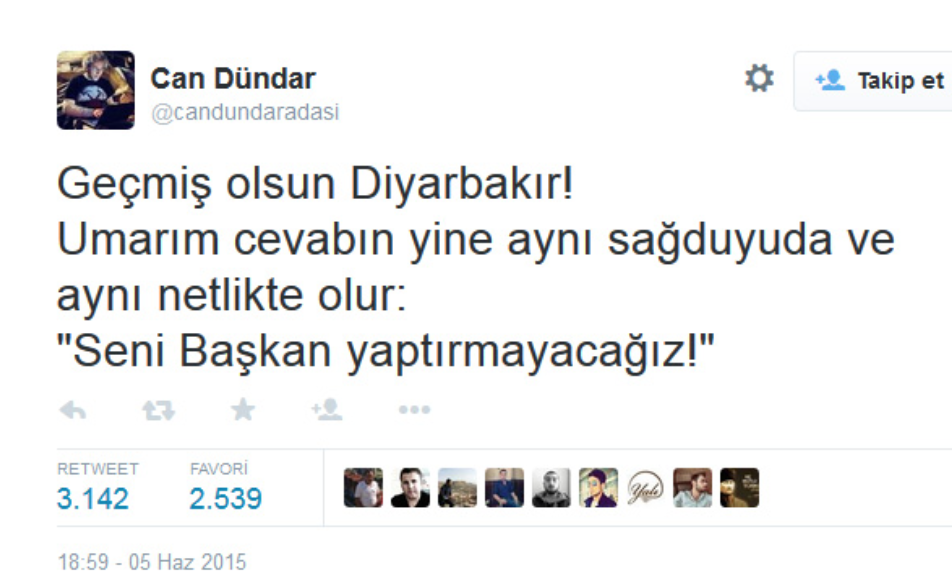 Hakkında casusluk soruşturması başlatılan Cumhuriyet Gazetesi Genel Yayın Yönetmeni Can Dündar, HDP’nin Diyarbakır mitingi öncesi meydana gelen patlama sonrası Twitter’dan, “Geçmiş olsun Diyarbakır! Umarım cevabın yine aynı sağduyuda ve aynı netlikte olur: ‘Seni Başkan yaptırmayacağız!” şeklinde skandal ifadeler kullandı. Patlama olayıyla Cumhurbaşkanı Erdoğan’ı ilişkilendirerek takipçilerinin de tepkisini toplayan Dündar’ın bu twiti sosyal medyada “provokatörlük” olarak değerlendirildi.