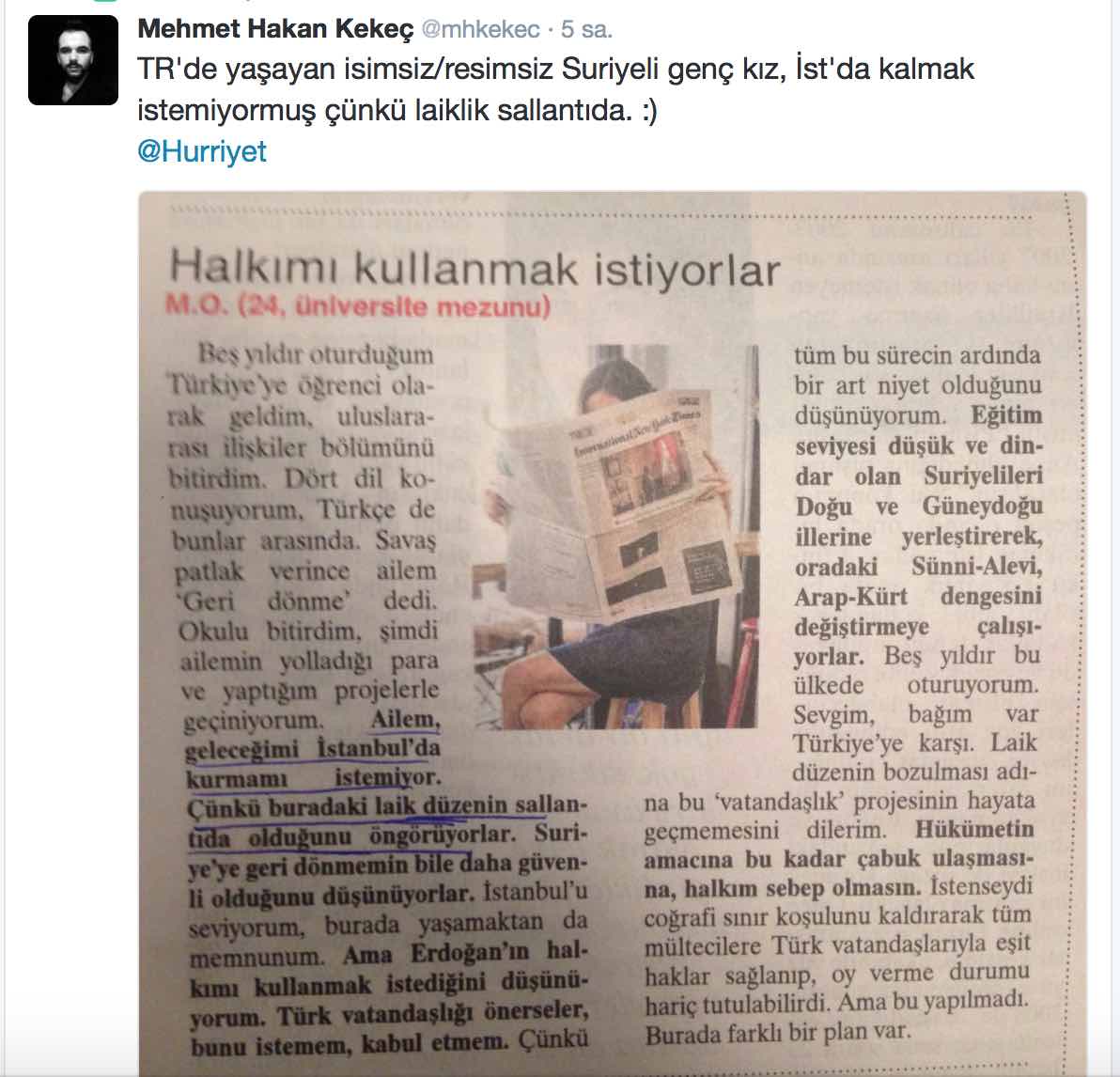 Haksözhaber sitesinde yer alan habere göre, Hürriyet’in “Türkiye’deki Suriyeli mülteciler” dediği bu isimler kim ve kaç kişi? Binlerce Suriyeli muhaciri ne oranda temsil ediyorlar? Bu soruları sorduğunuzda karşılaşacağınız tablo Hürriyet’in ucuz siyasetini ortaya koyuyor. Hürriyet açıkça kara propaganda yoluyla okurlarını manipüle ediyor. Çünkü “Türkiye’deki Suriyeli mülteciler”e indirgediği toplam kişi sayısı yalnızca orta halli 6 Suriyeli. Bu mikrofon uzatılan Suriyeliler de seküler-laik eğilimlere sahip. Üstelik de 5’i Hürriyet’in sansasyonel sorularına nötr cevap vermiş! Hürriyet yalnızca fotoğrafına yer vermekten hicap duyduğumuz hicapsız bir Suriyeli öğrenciden umduğu cevapları almış. Ve bunun beyanlarını da seçici bir mantıkla manşete taşıyarak görüleni değil görmek istediğini öne çıkarmış!