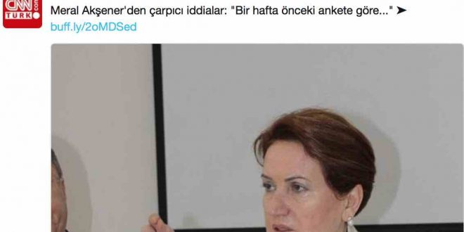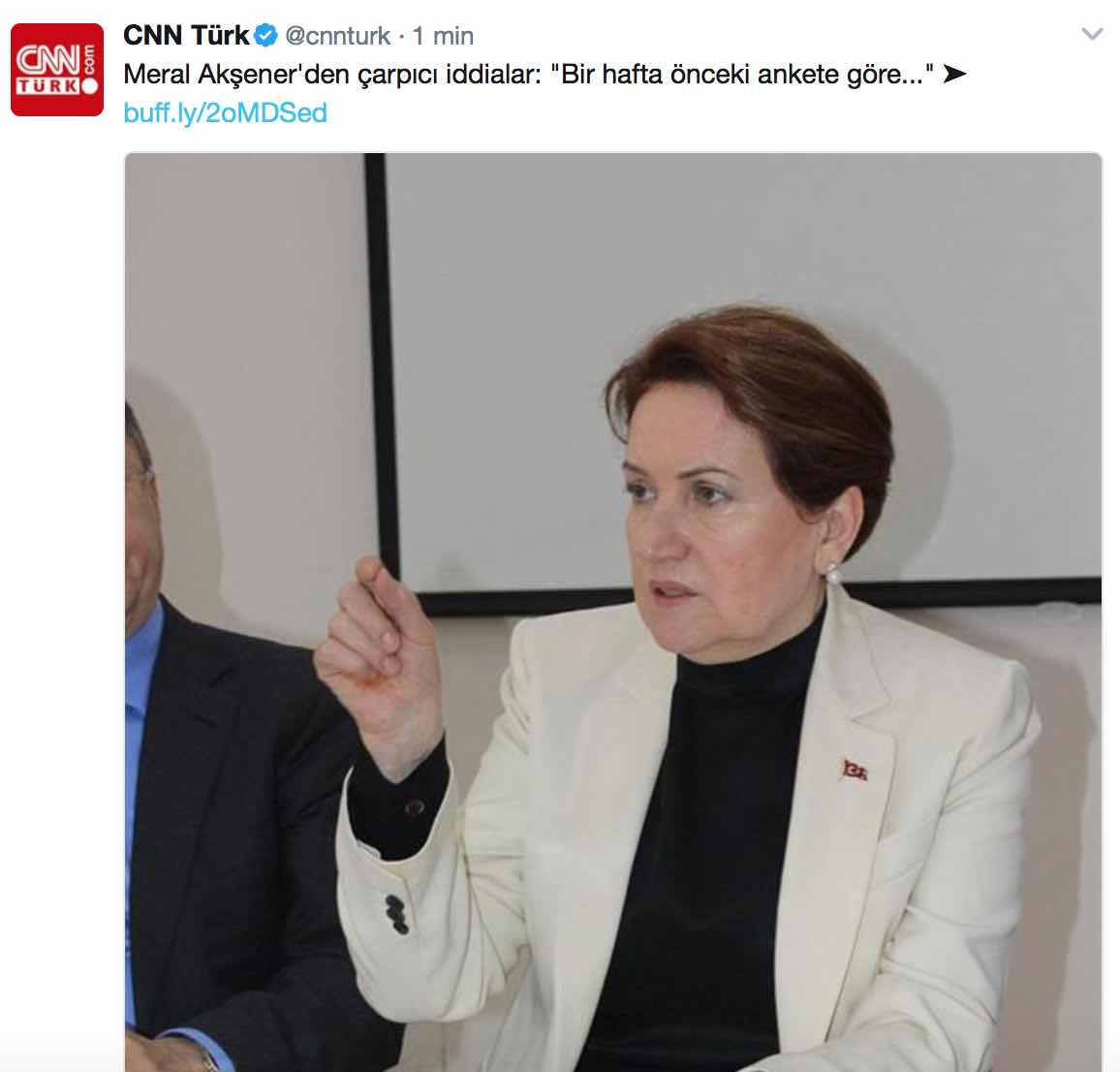 Aydın Doğan’a ait medya grubu “tarafsız” görünümü altında bir yandan sinsice FETÖ’nün desteklediği Meral Akşener’e de PR yapmayı ihmal etmiyor. Akşener’in ne kadar ciddiyetsiz sözleri varsa Doğan medyasında “çarpıcı ifadeler” adı altında manşete çekiliyor. İşte CNN Türk örneği…