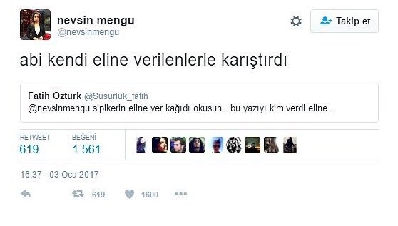 CNN Türk’ün atarlı ve militan spikeri Nevşin Mengü son olarak Twitter’da yaptığı terbiyesizlikle iyice haddini aştı, Doğan medyası işten kovmak yerine Mengü’yü bir hafta zorunlu izne çıkardı.