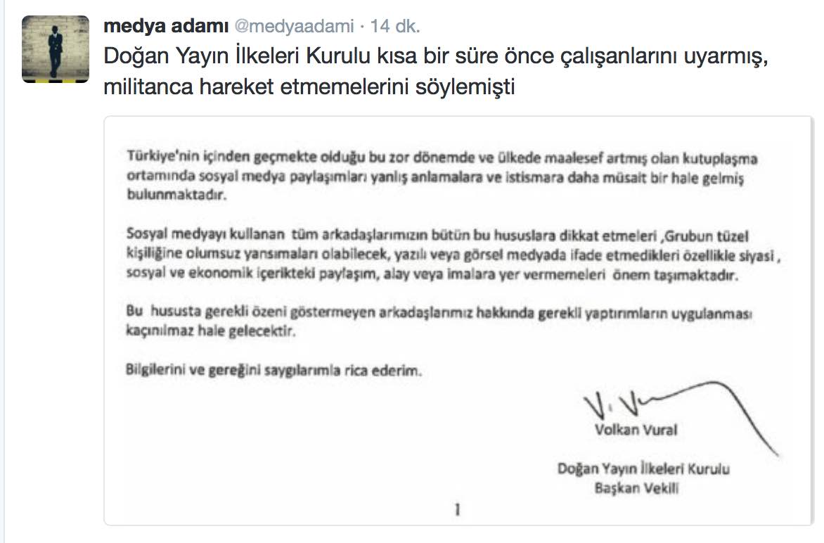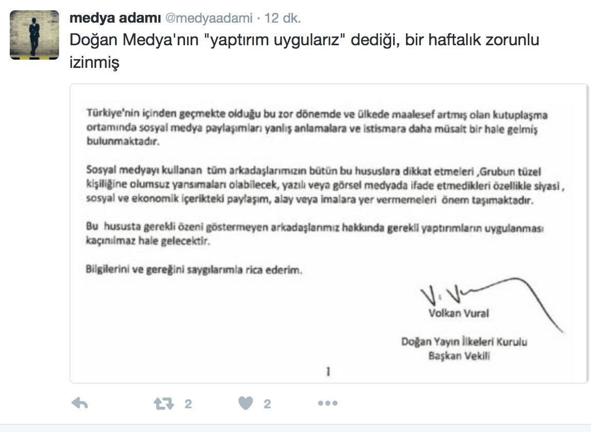 Doğan medyası daha geçtiğimiz gün sosyal medyada Doğan grubu çalışanlarının dikkat etmesi gerektiği uyarısı yapmasına rağmen, Mengü ödül gibi bir ceza ile bir hafta zorunlu izne çıkarıldı. Doğan medyasının tüm kirli algı operasyonlarının baş tetikçisi Mengü’nün son terbiyesizliğine de göz yumulması artık pes dedirtti.