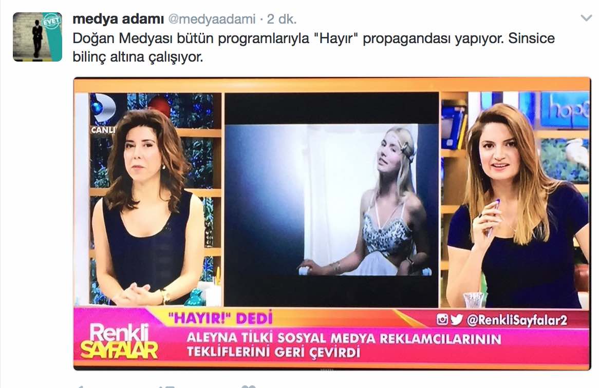 Kanal D ve Star TV’de yayımlanan dizilerde, referandum öncesi halkın tercihini ‘Hayır’ yönünde etkilemeye dönük algı çalışması tüm hızla devam ediyor. ‘Hayat Şarkısı’, ‘Kara Sevda’ ve Adı Efsane’ dizilerinde kurgulanan oylama sahnelerinde ‘Hayır’ kararı çıkıyor ve ‘Her şey Hayır’lı olacak’ repliği vurgulanıyor. Özellikle Doğan medyasının “hayır” için sinsice operasyon yaptığı gözleniyor. Son olarak da Kanal D’de yayınlanan bir magazin programında “hayır” için algı çalışması yaptılar.