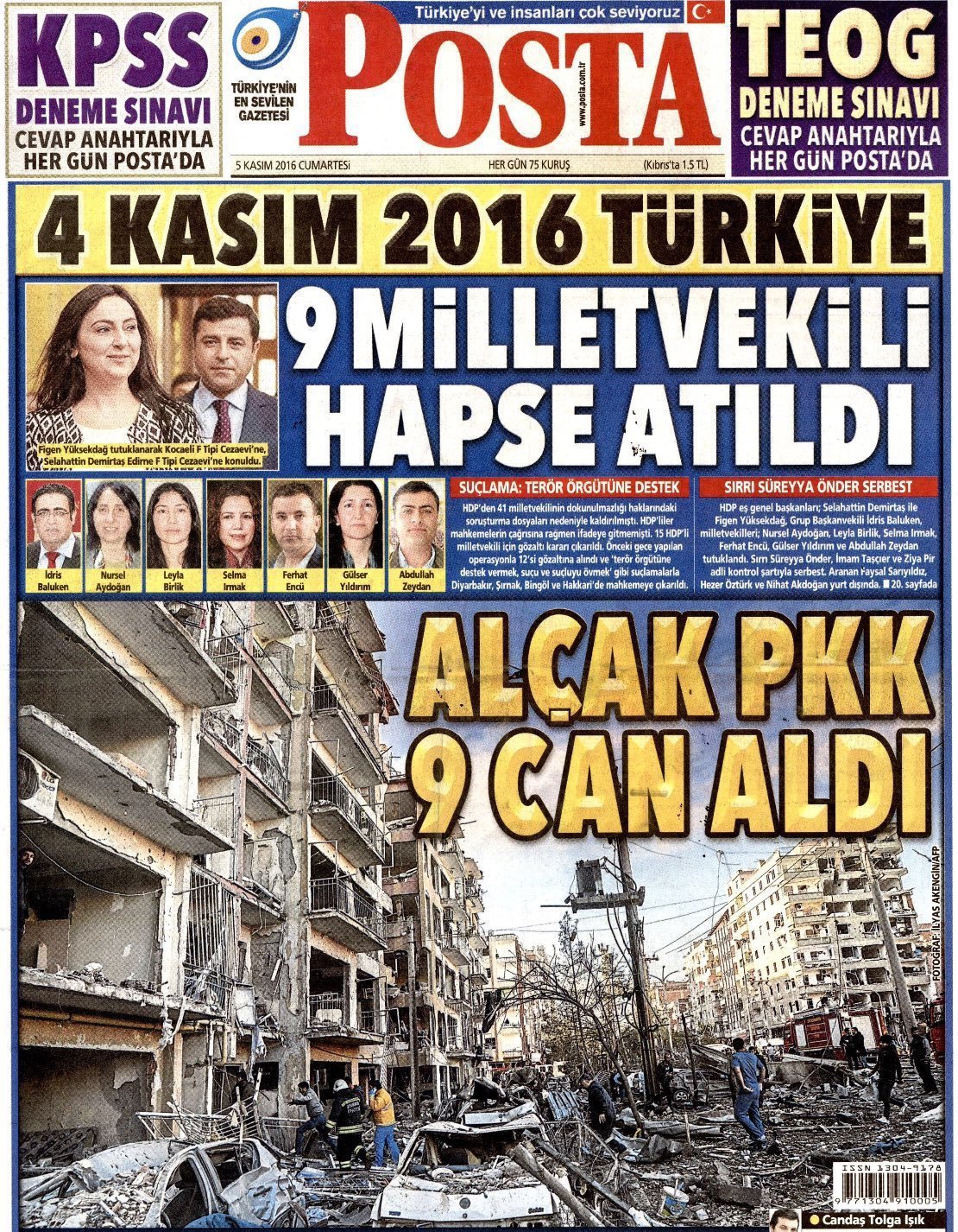 Aydın Doğan’ın sahibi olduğu Posta gazetesi, bugünkü gazetenin ilk sayfasında terör örgütü PKK’ya destek oldukları için tutuklanan HDP’li vekilleri savunurken hemen altında Diyarbakır’daki hain terör saldırısından dolayı terör örgütü PKK’yı kınaması bu kadar da olmaz dedirtti.