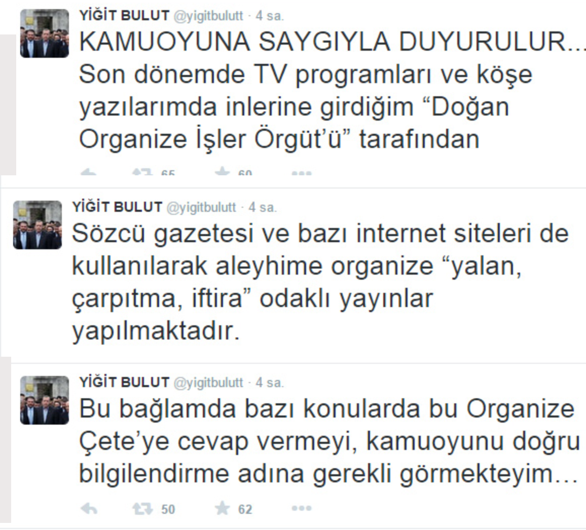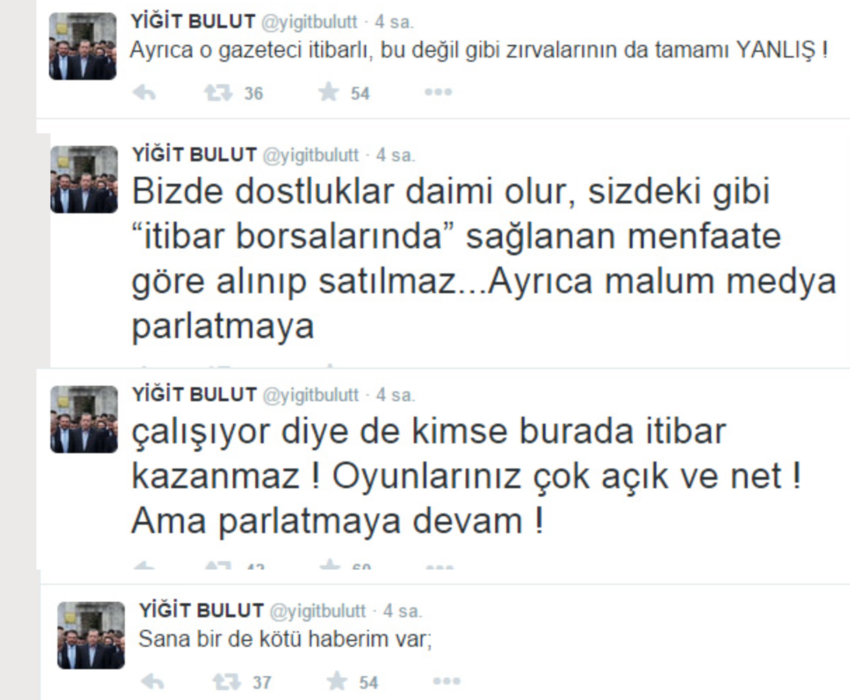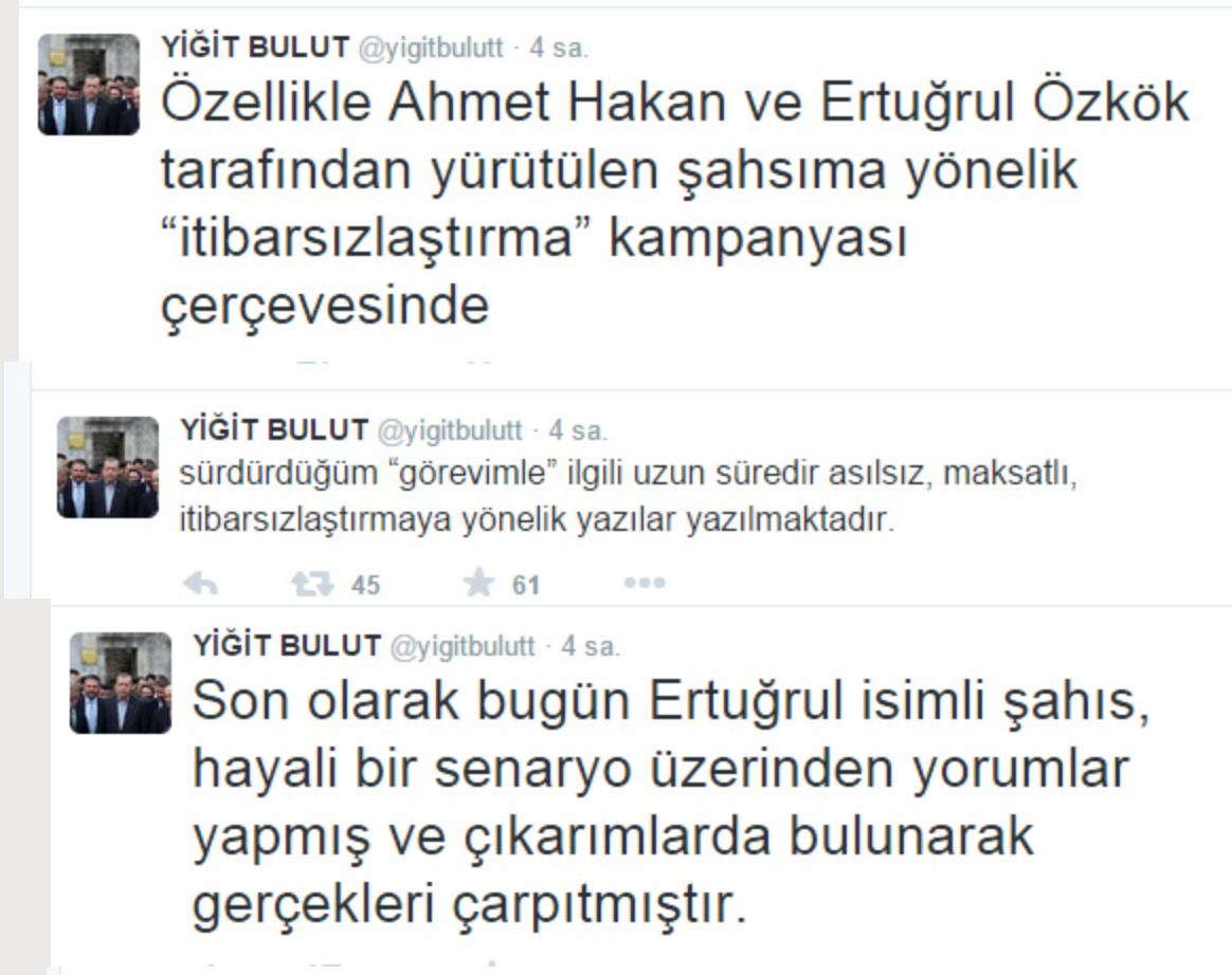 Cumhurbaşkanı Başdanışmanı Yiğit Bulut, rahatsızlığı nedeniyle Erdoğan’ın Çin gezisine katılamaması üzerine Ertuğrul Özkök’ün yaptığı gerçek dışı yorumlar ve ortaya attığı iftiralar için ”Bak Ertuğrul kardeşim, yine baltayı taşa vurmuşsun… Belli ki o geziye katılan bir gazeteci sana Yiğit gelmedi demiş… Kriminolog-Triminolog falan hikaye, senin içeride ne kaynağın var ne de seni muhatap alacak bir ses… Resmi bir isimle konuşma imkanın olsa zaten doğruyu öğrenebilirsin… Aklınca beni kamuoyu önünde itibarsızlaştırıyorsun… Neredeyse 8 yıldır bana bunu yapmaya çalışıyorsunuz, sonuçlarına iyi bakın! Bak güzel kardeşim, Çin gezisinin kadrosunda yokmuş diyorsun, gülsem mi, ağlasam mı! En acısı da sana cevap versem mi! Gezi için bütün hazırlığımı tamamlamama hatta bir gün önce, Salı gecesi yayınlanacak TV programını çekip “siz seyrederken Çin’de olacağım” dememe rağmen, o gece sabaha kadar düşürülemeyen Yüksek Tansiyon sorunu nedeniyle geziye katılamadım. Üstelik yaklaşık 15 gündür rahatsızlığım devam ediyor…” diye yazdı.