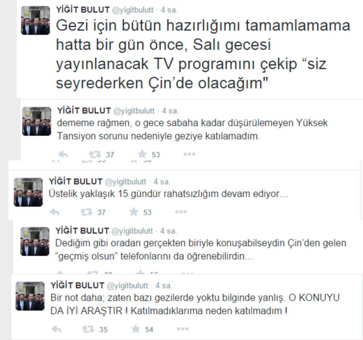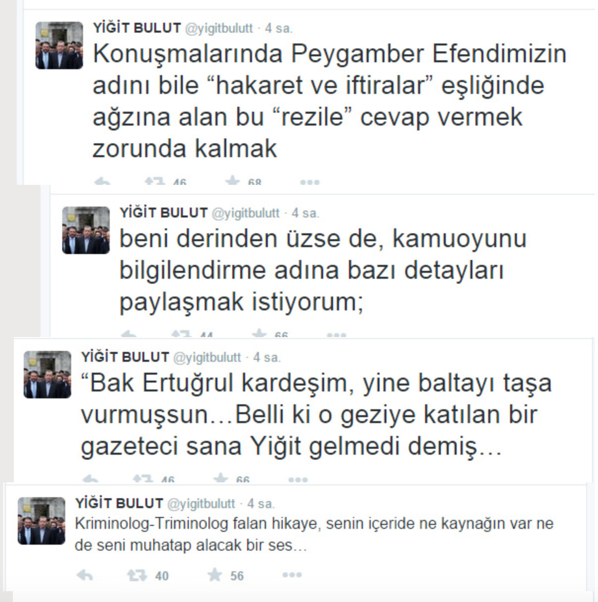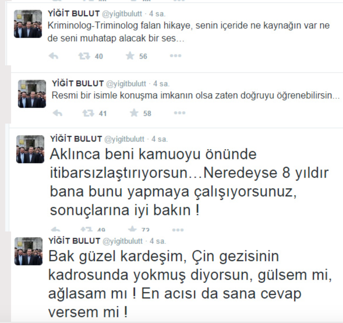 “Bak Ertuğrul kardeşim, yine baltayı taşa vurmuşsun… Belli ki o geziye katılan bir gazeteci sana Yiğit gelmedi demiş… Kriminolog-Triminolog falan hikaye, senin içeride ne kaynağın var ne de seni muhatap alacak bir ses… Resmi bir isimle konuşma imkanın olsa zaten doğruyu öğrenebilirsin… Aklınca beni kamuoyu önünde itibarsızlaştırıyorsun… Neredeyse 8 yıldır bana bunu yapmaya çalışıyorsunuz, sonuçlarına iyi bakın! Bak güzel kardeşim, Çin gezisinin kadrosunda yokmuş diyorsun, gülsem mi, ağlasam mı! En acısı da sana cevap versem mi! Gezi için bütün hazırlığımı tamamlamama hatta bir gün önce, Salı gecesi yayınlanacak TV programını çekip “siz seyrederken Çin’de olacağım” dememe rağmen, o gece sabaha kadar düşürülemeyen Yüksek Tansiyon sorunu nedeniyle geziye katılamadım. Üstelik yaklaşık 15 gündür rahatsızlığım devam ediyor… Dediğim gibi oradan gerçekten biriyle konuşabilseydin Çin’den gelen “geçmiş olsun” telefonlarını da öğrenebilirdin… Bir not daha; zaten bazı gezilerde yoktu bilginde yanlış. O KONUYU DA İYİ ARAŞTIR! Katılmadıklarıma neden katılmadım! Ayrıca o gazeteci itibarlı, bu değil gibi zırvalarının da tamamı YANLIŞ! Bizde dostluklar daimi olur, sizdeki gibi “itibar borsalarında” sağlanan menfaate göre alınıp satılmaz… Ayrıca malum medya parlatmaya çalışıyor diye de kimse burada itibar kazanmaz! Oyunlarınız çok açık ve net! Ama parlatmaya devam!