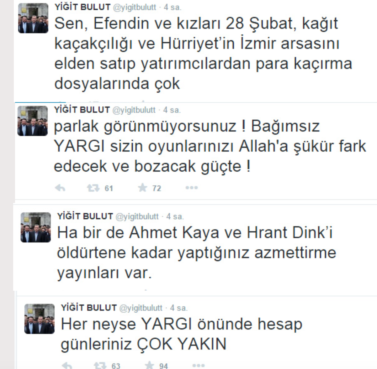 Yiğit buluta saldırmalarının sebebi kendileri gibi Batının Ab nin ingiliz i değil Tam bağımsız ve güçlü bir Türkiyeyi savunuyor olması Tüm yazılarında bu batının yardakçısı vatan hainlerini teşhir ediyor.o nedenle saldırmaları normaldir. Yiğit bulut gibi milli menfaat peşinde olanlar batının menfaati peşinde koşanların korkulu rüyasıdır..Ama ne yaparlarsa yapsınlar başaramayacaklar. şu zor günlerimizde pkk borazanlığı yapmaya hala devam eden ertuğrul özkök gibilerin başını ezeceğimiz günler çok yakın inşallah!