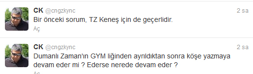 Koyuncu’nun “Dumanlı Zaman’ın GYM liğinden ayrıldıktan sonra köşe yazmaya devam eder mi ? Ederse nerede devam eder ? Bir önceki sorum, TZ Keneş için de geçerlidir.” twiti, Dumanlı ile Keneş’in görevden alınacakları yorumlarına neden oldu.