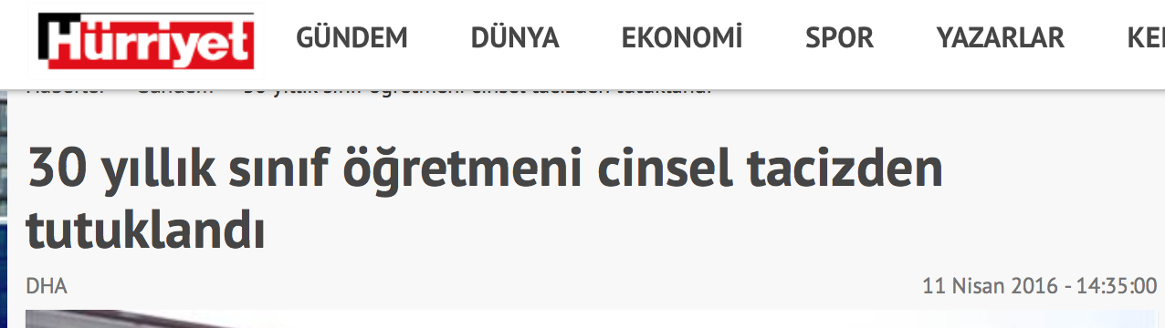 Tokat’ta görev yaptığı ilkokulda kız öğrencilerine elle tacizde bulunduğu iddia edilen Eğitim- Sen üyesi öğretmen Muharrem G., tutuklandı. Tacizci öğretmenin PKK sempatizanı Eğitim-Sen üyesi olduğu detayına ise Doğan Haber Ajansı ve Hürriyet gazetesi tarafından yer verilmedi.