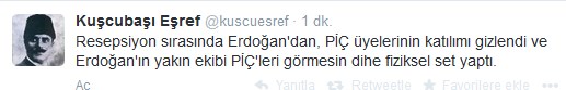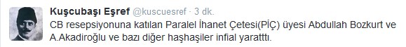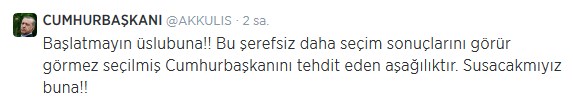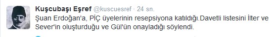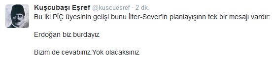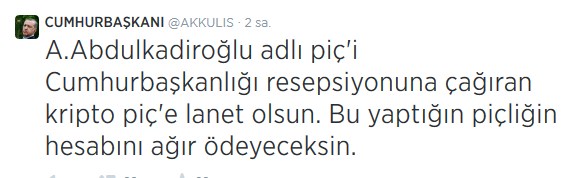C. Başkanlığı makamına olan saygımızı bazıları farklı anlıyor herhalde! O zaman bizde yazmaya başlayalım. Ulan Kemal İlter, Ahmet Sever, Osman Çangal kendiniz bir bok mu sanıyorsunuz. Milletin alının ortasını ortasını kaşıyorsunuz? Bu ülkenin seçilmiş Cumhurbaşkanını, tüm kurumlarını… tehdit eden zağarı resepsiyona davet ederek ne yapmaya çalışıyorsunuz? PİÇ ve OÇ’ları olarak bizler hala ayaktayız mesajını mı vermek istiyorsunuz? Ki, durum öyle gösteriyor. Şurada onbeş gününüz kalmışken ne ulan kostak kostak yürüyerek çakal ayaklarına yatıyorsunuz. Siz de mi Haşhaş+Kolonya+İspirto’nun gözüne gözüne verdiniz? Orası devlete, millete posta koyma yeri mi ulan? Bu ülkede korku imparatorlukları kurup, hala onu devam ettirmek isteyen çakallar sürüsü size adam olun demedik mi lan? Orasını babanızın çiftliği mi sanıyorsunuz dingiller? Tabi sadece suçu sizde aramıyoruz. Suçun büyüğü belli, hatıra binaen şimdilik bu konuda susuyoruz. Ama bu böyle devam ederse ağzımızı kimsenin kapatamayacağını bilin.