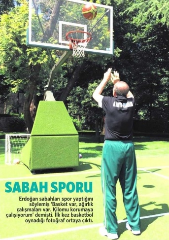 Vatan gazetesinin yayımladığı fotoğrafta Erdoğan, yeşil eşofman ve üzerinde “R. Tayyip Erdoğan” yazılı siyah tişört ile potaya atış yaparken görülüyor. Erdoğan sabahları spor yaptığını daha önce de dile getirmiş, “Basket var ağırlık çalışmaları var. Kilomu korumaya çalışıyorum” demişti.