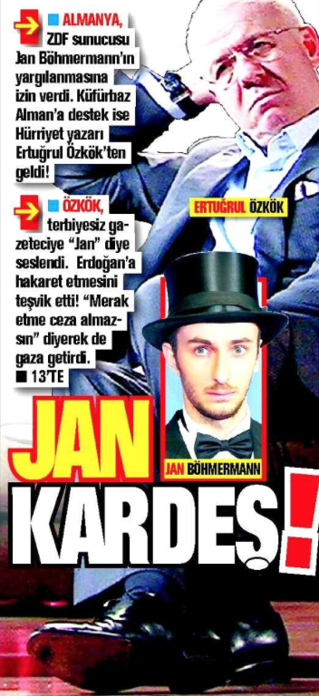 Janlı yayın Alman medya devi Axel Springer’in patronu Mathias Döpfner’den sonra, Döpfner’in maaşlı elemanı Ertuğrul Özkök de sahne aldı. Hürriyet yazarı, gazetesinin Alman ortağı Bild’e yazdı. Cumhurbaşkanı Erdoğan’ın özgürlük karşıtı olduğunu belirtti, Jan Böhmermann’a moral verip sahip çıktı