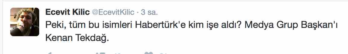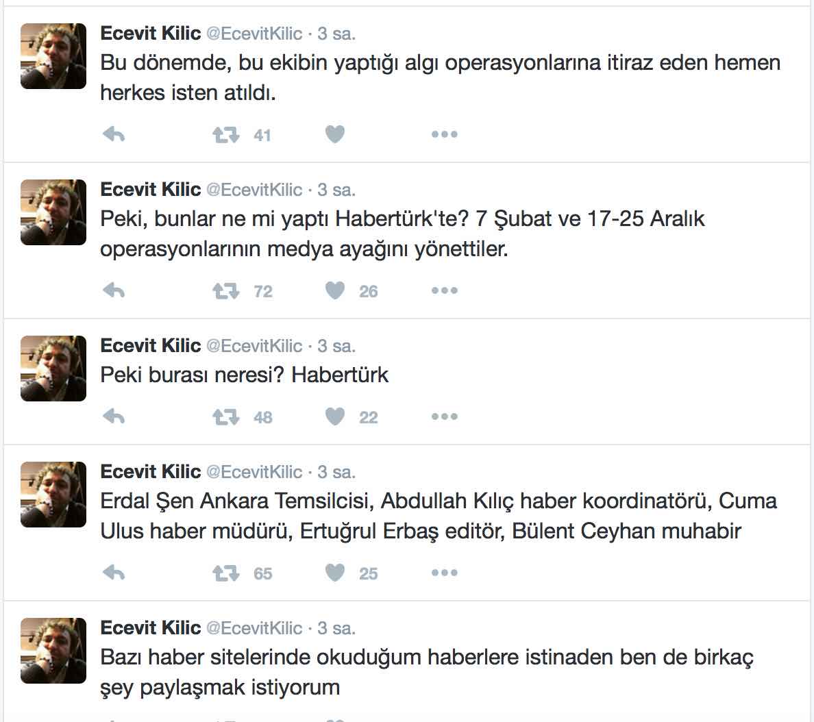 Habertürk’ü FETÖ’cü teröristlerle nasıl doldurulduğu ve bu işin arkasında Ciner Medya Grup Başkanı Kenan Tekdağ olduğuna dair şok açıklamalar eski Habertürk çalışanı Ecevit Kılıç’tan da geldi. İşte gazeteci Kılıç’ın tweetleri: