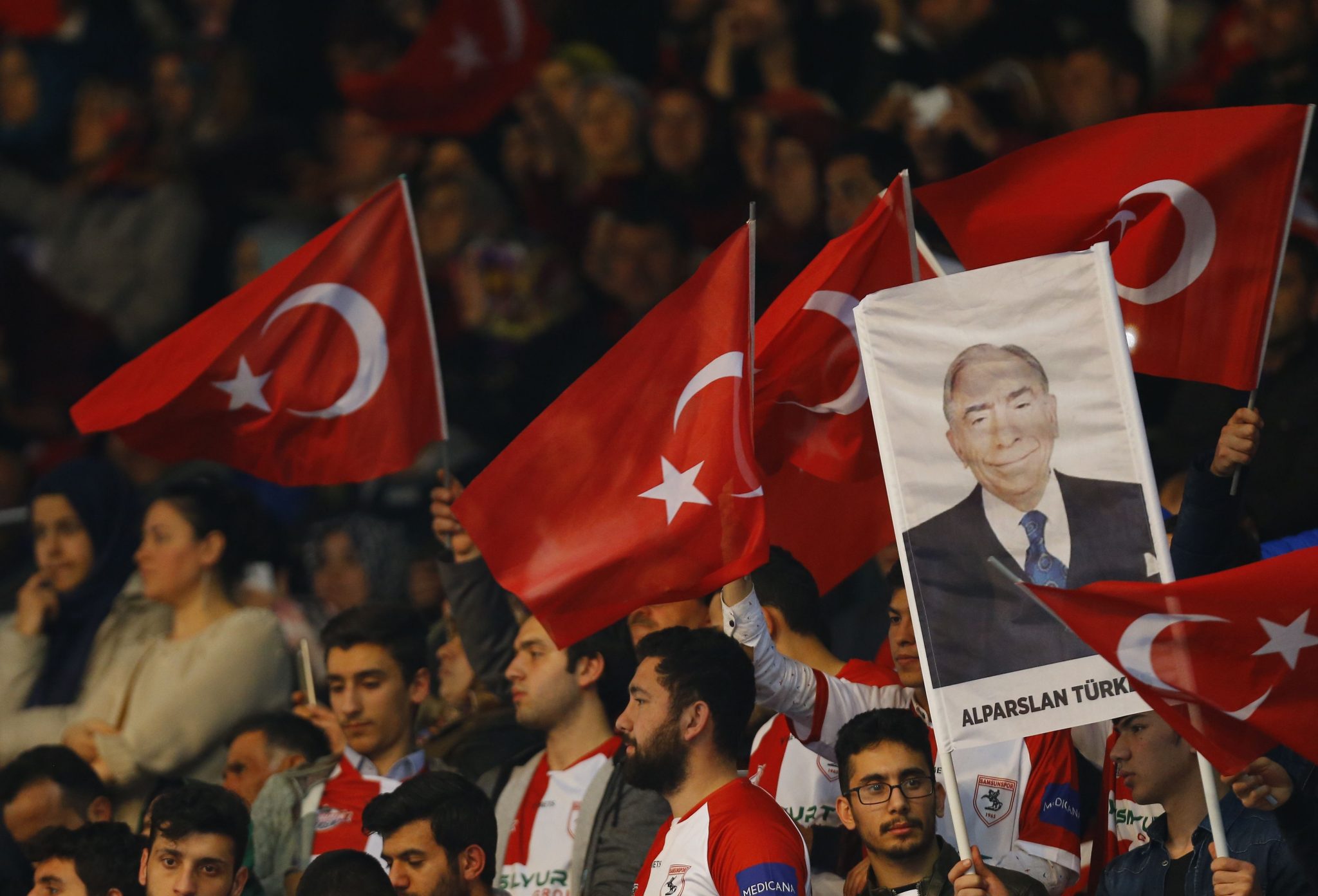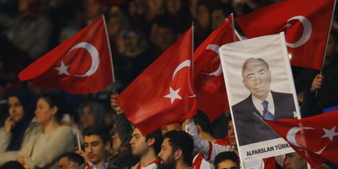 AK Parti’nin referandum sürecini başlattığı kampanya tanıtımına katılan Ülkücüler, Alparslan Türkeş pankartı açtı.