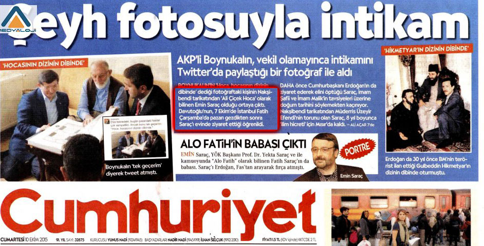 Cumhuriyet gazetesi bugün skandal manşetinde Ali Çiçek’in Emin Saraç Hoca olduğunu iddia ettiler. Cumhuriyet’in rezalet haberinde, Başbakan Ahmet Davutoğlu’nun Fatih’te “Nakşibendi tarikatından ‘Ali Çiçek Hoca’ olarak bilinen Emin Saraç’ı Fatih’teki evinde ziyaret ettiği” gibi bir saçmalığa imza attılar.