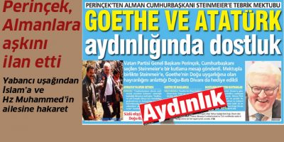 Çanakkale’de Türklerin münevverleri ve gençlerini kırdırma görevi verilen ve İttihatçı maşalarla iş tutarak bu görevi başarı ile yerine getiren Almanya’yı, Türk ‘dostu’ olarak gösteren karanlıklar prensi Perinçek’in kendisi açısından da tehlikeli bir oyun oynadığı ileri sürüldü. Almanya Cumhurbaşkanı’na Alman Goethe’nin ‘Batı-Doğu Divanı’nı hediye ederek, ben de sizdenim mesajı veren Vatan Partisi Genel Başkanı, dün yayın organı Aydınlık’ta konuyu manşet yaptırdı. ‘Goethe ve Atatürk aydınlığında dostluk’ başlığı ile verilen haber, Perinçek’in saf değiştirmese bile ilişkilerini açık etmesi bakımından son derece önemli bir gelişme olarak yorumlandı.