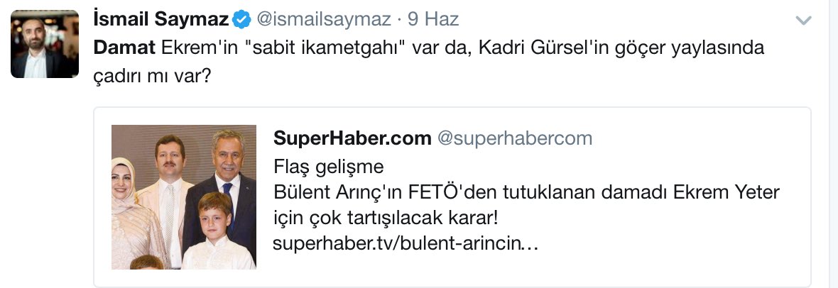 FETÖ’nün patronlar kulübü TUSKON davasında tutuklu iken tartışmalı ve şaibeli bir hastalık raporu ile serbest bırakılan İstanbul Büyükşehir Belediye Başkanı Kadir Topbaş’ın damadı Ömer Faruk Kavurmacı’nın ardından, yeni bir FETÖ’cü damat skandalı daha yaşandı. Eski TBMM Başkanı Bülent Arınç’ın FETÖ’cü damadı Ekrem Yeter, 3 gün içinde gözaltına alınıp, tuuklanıp, serbest bırakıldı. Sanki tutuklanması bir tezgahmış gibi FETÖ davalarının sulandırılması ve akamete uğraması için geniş kapsamlı çevrelerce algı operasyonuna malzeme edildi.