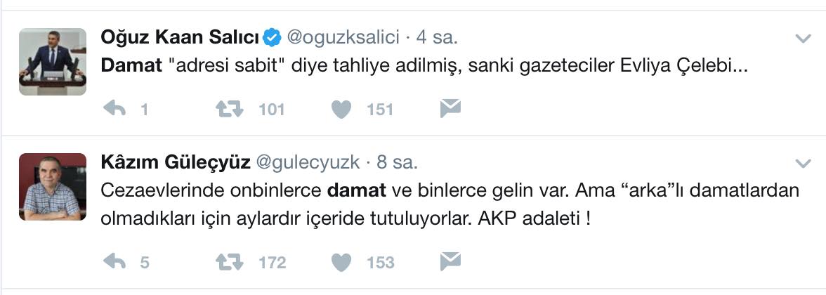 FETÖ’cü damatların salıverilmesi üzerinden başta FETÖ, CHP, muhalif çevreler ve kriptolar yoğun bir mesai harcıyorlar. Tam da tahliyeler FETÖ’ye yarasın diye, “Gazeteciler içerde damatlar dışarda”, “Kadri Gürsel, Ali Bulaç, Ahmet Şık’ın suçu ne” konulu algı operasyonu hız kesmeden devam ediyor.