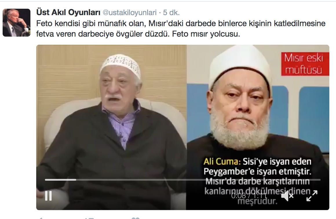 Teröristbaşı Fetullah Gülen son konuşmasında Mısır’ın eski müftüsü ve darbeci Sisi’nin savunucusu Ali Cuma’ya övgüler düzdü. Ali Cuma’nın Mısır’da FETÖ mensuplarını savunduğunu söyleyen Gülen “Ali Cuma Hocaefendi Hazretleri buyurdular. Allah uzun ömür ihsan eylesin. O Mısır’da sizi müdafaa etti” dedi. Mısır’ın eski müftüsü Ali Cuma, ‘Sisi’ye isyanın Peygambere isyan olacağını’ söyleyerek İslam dünyasından büyük tepki çekmişti. “Mısır’da darbe karşıtlarının kanlarının dökülmesinin dinen meşru olduğunu” söyleyen Cuma’yı Dünya Müslüman Alimler Birliği Başkanı Dr. Yusuf el-Karadavi sert bir dille eleştirmiş ve hadis uydurduğunu söylemişti.