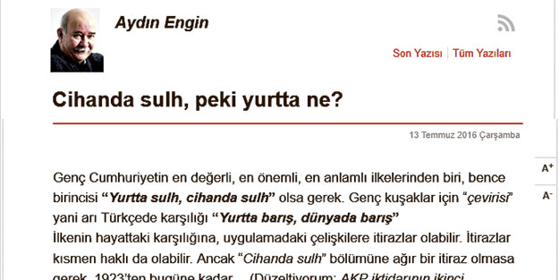İtirafçı darbecilerden alınan bilgiler ışığında teşebbüsünün alt kademeye iletildiği tarih olan ve Adil Öksüz’ün darbe talimatıyla ABD’den Türkiye’ye giriş yaptığı 13 Temmuz’da Cumhuriyet’te yayınlanan “Cihanda sulh, peki yurtta ne?” başlıklı, TSK’daki ulusalcı kliği hareketlendirmeye yönelik yazı özetle şöyle: