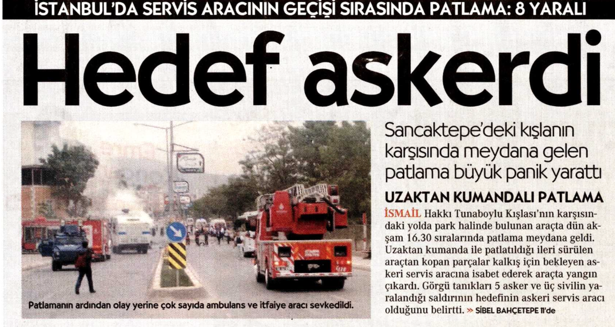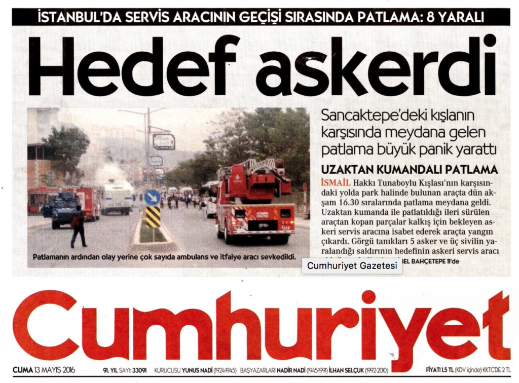 Cumhuriyet gazetesinin terör örgütlerini aklayan bir paçavra olduğunun son kanıtı… İstanbul Sancaktepe’de PKK terör örgütünün askeri aracın geçişi sırasında gerçekleştirdiği uzaktan kumandalı bombalı saldırı, Cumhuriyet gazetesinde yine terör örgütünün adı gizlenerek haberleştirildi. Sürmanşetten yayınladığı haberde Cumhuriyet, PKK terör örgütünün adını anmayarak yine terör paçavrası olduğunu gösterdi. Cumhuriyet aynı zamanda Fetocu terör örgütüne de çalışıyor.