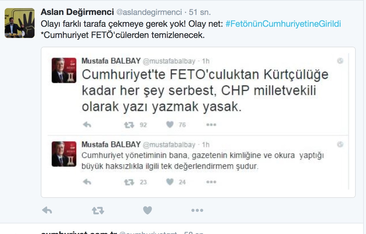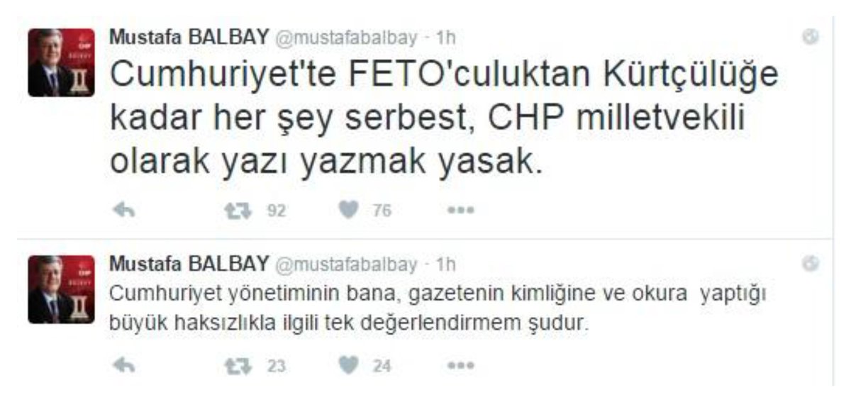 Mustafa Balbay, Twitter’dan “Cumhuriyet yönetiminin bana, gazetenin kimliğine ve okura yaptığı büyük haksızlıkla ilgili tek değerlendirmem şudur. Cumhuriyet’te FETO’culuktan Kürtçülüğe kadar her şey serbest, CHP milletvekili olarak yazı yazmak yasak” sözlerini paylaşmıştı.
